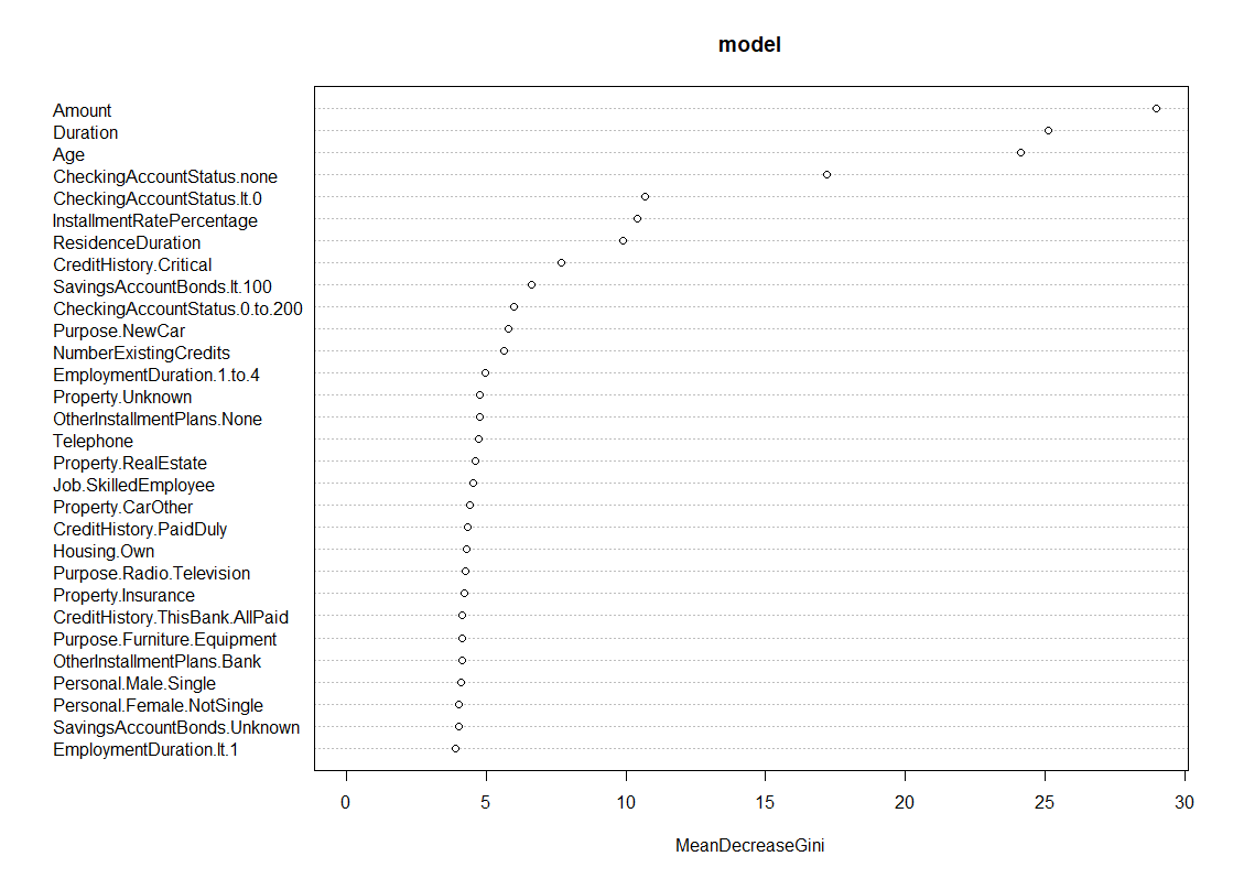 varImpPlot 함수를 이용하여 중요도그래프를 출력합니다.